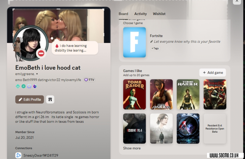 im 26 from usa texas im born with neurofibromatosis scoliosis and i have learning disbilty too i do like to play games silent hill resident evil tomb raider and demos horror on twitch and random games becz i might play what ever really i do love sleep so i sleep on and off when im feeling tired or hurting so yeah but i cant have kids becz cant take care of my self so yeah i cant do s*x but might only post pics of me thats about it though so yeah or i watch youtube or what ever really though but i hate when i cant do alot with my learning problums i cant spell god eaither i used to go to school as a kid and then i got homed schooled a t 16 and until then after got older i never went back my mom pulled me out of school but my birth mom did drugs smoke and drank when she had me and didnt take care of me my birth dad he didnt wantrd to pay chld suppoert and stuff he didnt wanted me and yeah