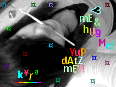 Ello there... im Kyra... you can either call me " kai kai " or " kiki ".... ( i like kiki better... :D ) LOL well anywayz...Let me tell you a little stuff about me.... I LOVE BOYS LIKE GIRLS!! OF COURSE who doesnt??? :P i know i know we all arent tha same...... Grrrr... WeLL iM tHa tYPe Of gAL whO wiLL..... JUMP ON STRANGERZ BACKS AND SAY "I LOVE YOU" .... LAUGH WHEN IT IS COMPLETLY QUIET..... KID AROUND WITH MY PUPPY.... and my favurite one of all..... SING TO MEYSLEF WEN IM LONELY!!! areNt i one of a kiNd!?!?!? :] LOL [: i LIKE to SMILE.... in PRIVATE because I....... BLUSH LIKEY MANIAC!!! WhOOpZ anotHer ConfeSSion.... :X i know... yer thinking dat im wierd right now.... BUT U KNOW CHU LOVEZ ME!!! :P itz ok i lovez u too!! :D HEheheheHEhheheHEhhehehehehHEHehhehe!!! ok my favurite culurs are.... ooooooooooooo LOL! arent they perdyful???!?!?? :3 btw... I DONT LIKE LABELING MEYSELF!! ALL I KNOW ISH DAT IM KYRA AND I WILL ALWAYZ BE KYRA.. dOi!!! :] im EbrY thIng In bEtWeeN!! [: and one more thing.... MY FABORITE WORD IS... ONOMATOPOEIA!!!! :) i like dat word cause itz funey!! yes i know it means something in english and other nincompoo.... SOOO WAT!!! its still foooney!!!